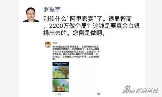 针对网友的质疑,papi酱的投资人罗振宇则在朋友圈回应称:“别传什么阿里家宴了。很显智商。2200万去做个局?这钱是要真金白银捐出去的。您倒是做啊。”
