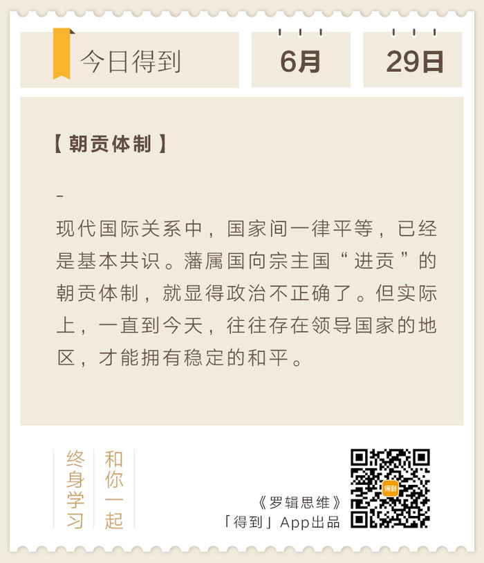 在今天的国际政治中,表面是沿袭了威斯特伐利亚体系的国家平等原则。但实质上,在很多地区却存在着朝贡体制的变种——某地区有个一家独大的国家,其他小国承认它的地位,它负责保护地区安全,照顾小国利益。虽然没有“进贡”等等形式,但本质是一回事。